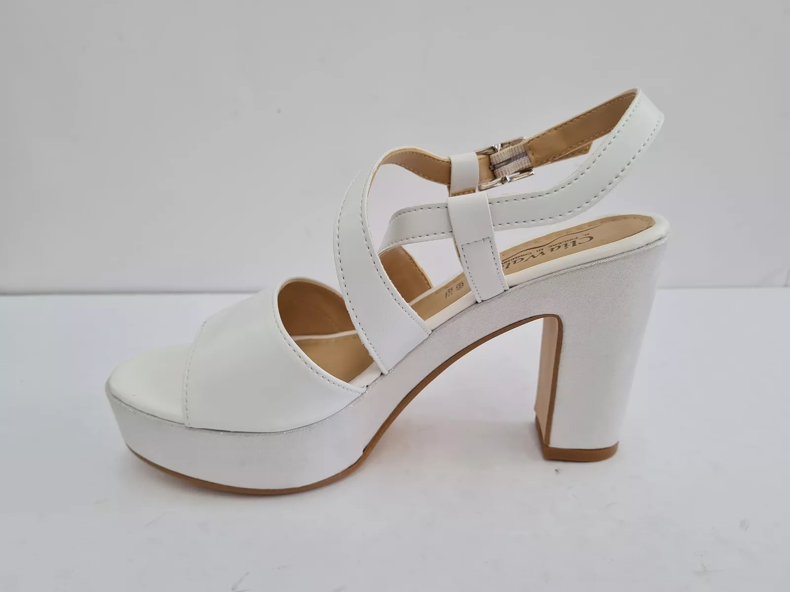 Sandali  ecopelle bianco dotati di sottopiede in vera pelle, plateau da 3 cm e tacco largo alto 9,5 cm.